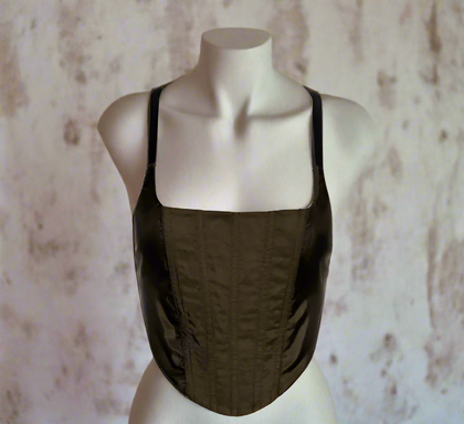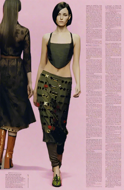 Product: Khaki nylon corset & pink organza pencil skirt runway ensemble